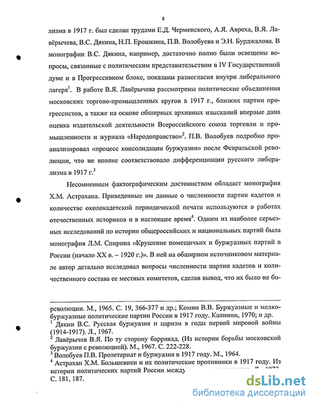 В связи с 50-летним юбилеем февральской и октябрьской революций 1917 г. вышло множество исследований по истории революций1. Хрестоматийным стал трехтомный труд И.И. Минца, который обстоятельно обосновывал тезис В.И. Ленина о том, что партия кадетов объединила в 1917г. представителей «правых группировок» и безуспешно пыталась стать партией «массовой» и «внеклассовой» . История либеральных партий затрагивалась также в трудах, посвященных органам центральной и местной власти в 1917 г., Временному правительству, Февральской и Октябрьской революции в Москве и Петрограде, истории гражданской войны в России3.
