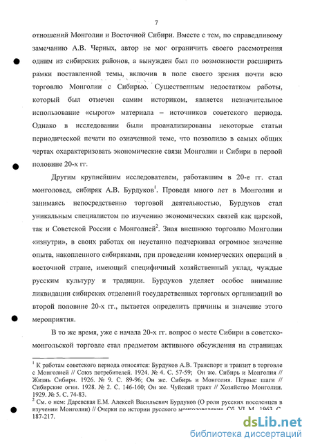 отношений Монголии и Восточной Сибири. Вместе с тем, по справедливому замечанию А.В. Черных, автор не мог ограничить своего рассмотрения одним из сибирских районов, а вынужден был по возможности расширить рамки поставленной темы, включив в поле своего зрения почти всю торговлю Монголии с Сибирью. Существенным недостатком работы, который был отмечен самим историком, является незначительное использование «сырого» материала - источников советского периода. Однако в исследовании были проанализированы некоторые статьи периодической печати по означенной теме, что позволило в самых общих чертах охарактеризовать экономические связи Монголии и Сибири в первой половине 20-х гг.