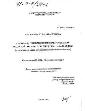 Актуальность темы исследования обуславливается важностью научного обобщения исторических фактов формирования и развития органов самоуправления. Однако создание серьезных научных обобщений и теоретических выводов в области изучения самоуправления требует максимального учета конкретных исторических материалов всех регионов России. В этом отношении большой научный интерес представляет анализ истории органов местного самоуправления в Казанской губернии, где наиболее полно можно проследить тенденции развития этих органов, на существование которых влияли местные социальные, историко-культурные особенности и традиции. Изучение реального осуществления законодательства, функционирования, стилей и методов деятельности органов местного самоуправления Казанской губернии раскрывает картины положения земских и городских органов самоуправления в регионе и в России в целом. С другой стороны многонациональность и существующие своеобразные формы самоуправления у местного населения, в том числе многочисленного мусульманского, позволяет
