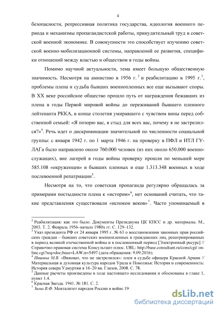 Помимо научной актуальности, тема имеет большую общественную значимость. Несмотря на амнистию в 1956 г. 2 и реабилитацию в 1995 г.3, проблемы плена и судьба бывших военнопленных, прошедших проверку, все еще вызывает споры. Преодоление идеологических штампов в отношении значительной по численности социальной группы, исследование сложных явлений военного периода во всей их совокупности с учетом исторических обстоятельств и