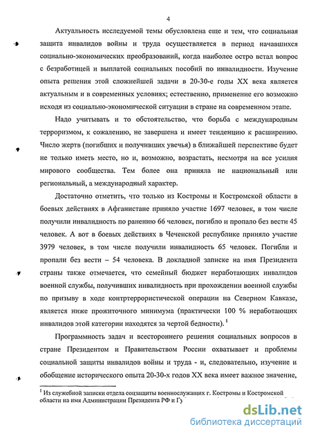 Программность задач и всестороннего решения социальных вопросов в стране Президентом и Правительством России охватывает и проблемы социальной защиты инвалидов войны и труда - и, следовательно, изучение и обобщение исторического опыта 20-30-х годов XX века имеет важное значение,