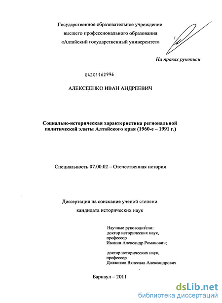 Алексеенко, Иван Андреевич. Социально-историческая характеристика региональной политической элиты Алтайского края : 1960-е - 1991 г. : диссертация ... кандидата исторических наук : 07.00.02 / Алексеенко Иван Андреевич; [Место защиты: Алт. гос. ун-т].- Барнаул, 2011.- 202 с.: ил. РГБ ОД, 61 11-7/728