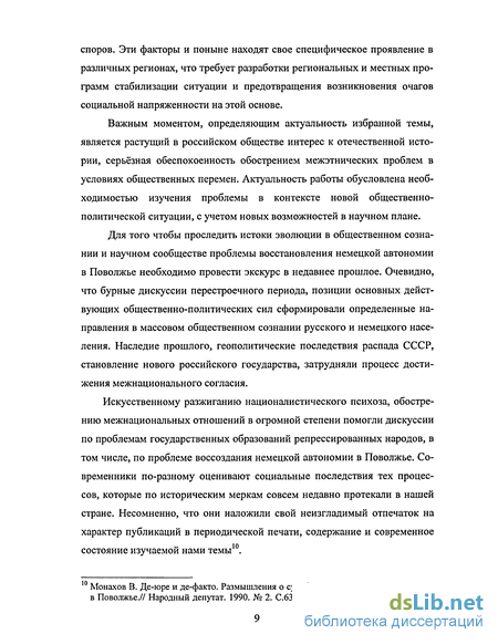 Особенное значение имеет знание реализации национальной политики в исторической ретроспективе, причём дифференцированно на каждом историческом этапе. Это, безусловно, относится и к избранной нами теме: создания, эволюции и ликвидации немецкой автономии на Волге в 1920-1941 гг. Актуальность исследования вызвана тем, что историческое изучение развития АССР НП позволит выработать рациональную форму регулирования национальных государственных формирований в современных условиях, в том числе, рационально применять все позитивное, избежать повторения негативных моментов и ошибок, имевших место в прошлом.