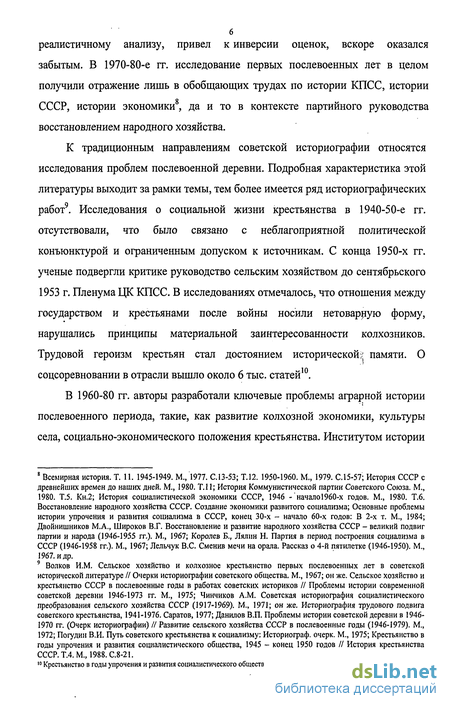 К традиционным направлениям советской историографии относятся исследования проблем послевоенной деревни. Подробная характеристика этой литературы выходит за рамки темы, тем более имеется ряд историографических работ9. Исследования о социальной жизни крестьянства в 1940-50-е гг. отсутствовали, что было связано с неблагоприятной политической конъюнктурой и ограниченным допуском к источникам. С конца 1950-х гг. ученые подвергли критике руководство сельским хозяйством до сентябрьского 1953 г. Пленума ЦК КПСС. В исследованиях отмечалось, что отношения между государством и крестьянами после войны носили нетоварную форму, нарушались принципы материальной заинтересованности колхозников. Трудовой героизм крестьян стал достоянием исторической;; памяти. О соцсоревновании в отрасли вышло около 6 тыс. статей10.