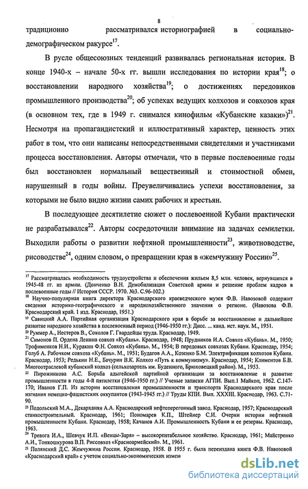 В русле общесоюзных тенденций развивалась региональная история. В конце 1940-х - начале 50-х гг. вышли исследования по истории края18; о восстановлении народного хозяйства19; о достижениях передовиков промышленного производства20; об успехах ведущих колхозов и совхозов края (в основном тех, где в 1949 г. снимался кинофильм «Кубанские казаки»)21. Несмотря на пропагандистский и иллюстративный характер, ценность этих работ в том, что они написаны непосредственными свидетелями и участниками процесса восстановления. Авторы отмечали, что в первые послевоенные годы был восстановлен нормальный вещественный и стоимостной обмен, нарушенный в годы войны. Преувеличивались успехи восстановления, за которыми не было видно жизни самих рабочих и крестьян.