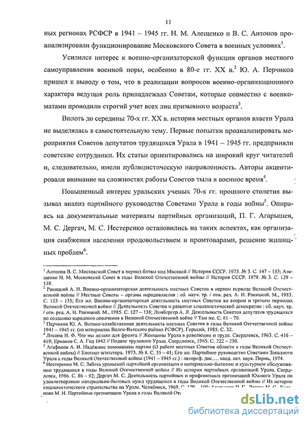 Разработка отдельных аспектов избранной нами темы нашла отражение в трудах по истории права. И. Н. Ананов и В. Ф. Коток в 40 - 50-е гг. XX в. проанализировали отдельные формы и методы организаторской работы Советов среди населения в годы войны, не затронув при этом специфику, присущую органам власти на местах, обусловленную их территориальным расположением.