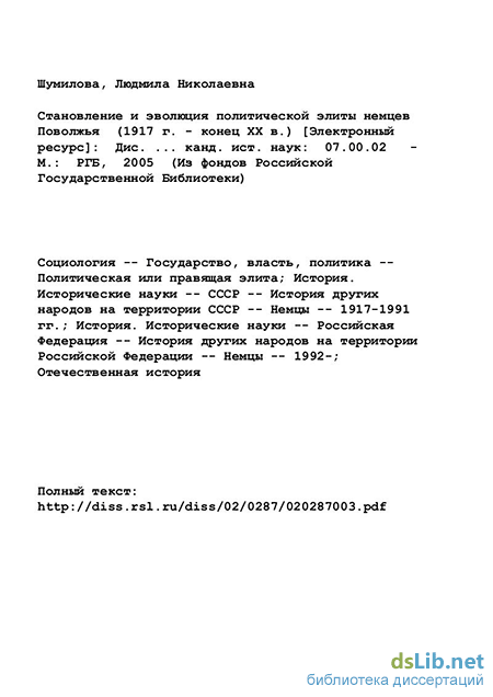 - Формирование и функционирование политической элиты поволжских немцев в перестроечный и постперестроечный периоды