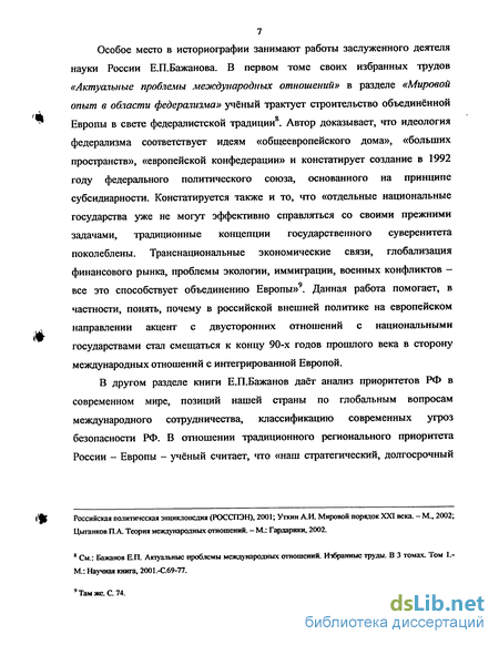 Особое место в историографии занимают работы заслуженного деятеля науки России Е.П.Бажанова. В первом томе своих избранных трудов «Актуальные проблемы международных отношений» в разделе «Мировой опыт в области федерализма» учёный трактует строительство объединённой Европы в свете федералистской традиции8. Автор доказывает, что идеология федерализма соответствует идеям «общеевропейского дома», «больших пространств», «европейской конфедерации» и констатирует создание в 1992 году федерального политического союза, основанного на принципе субсидиарности. Констатируется также и то, что «отдельные национальные государства уже не могут эффективно справляться со своими прежними задачами, традиционные концепции государственного суверенитета поколеблены. Транснациональные экономические связи, глобализация финансового рынка, проблемы экологии, иммиграции, военных конфликтов -все это способствует объединению Европы»9. Данная работа помогает, в частности, понять, почему в российской внешней политике на европейском направлении акцент с двусторонних отношений с национальными государствами стал смещаться к концу 90-х годов прошлого века в сторону международных отношений с интегрированной Европой.