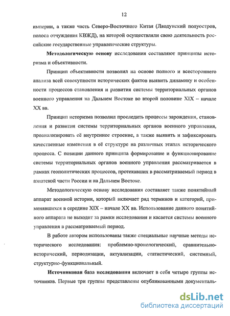 Анализ научных работ современного периода показывает, что проблемы формирования и функционирования системы территориальных органов военного управления в рамках структуры государственной власти, существовавшей на Дальнем Востоке во второй половине XIX - начале XX вв., до настоящего времени не получили должного освещения. Указанная тема не была также предметом специального исследования и освещалась лишь в контексте других исторических вопросов и проблем, которые исследовали вышеуказанные авторы. Каких-либо комплексных исследований по изучаемому вопросу не имеется.