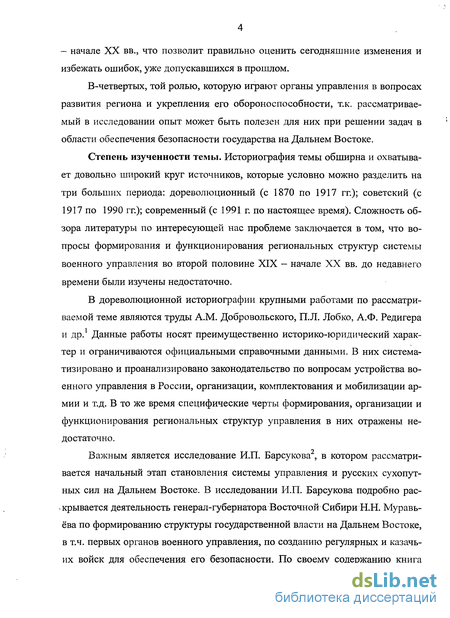 Частично проблемы управления регионом и находящимися здесь войсками, а также отдельные вопросы деятельности органов управления по обеспечению безопасности Дальнего Востока рассматривались в трудах по истории международных отношений15, «История дипломатии»16, а также книгах А.А. Алексеева, А.И. Алексеева, Е.Л. Беспрозванных, П.И. Кабанова, В.М. Ка-бузана и др.17 Правда, вопросы становления и развития системы управления не нашли в них существенного отражения.