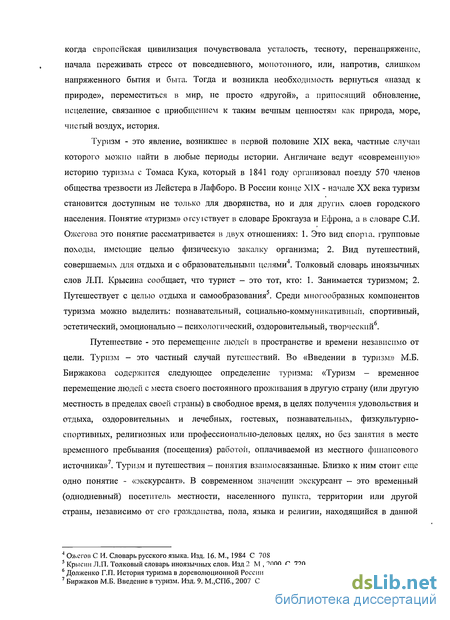 Туризм - это явление, возникшее в первой половине XIX века, частные случаи которого можно найти в любые периоды истории. Англичане ведут «современную» историю туризма с Томаса Кука, который в 1841 году организовал поезду 570 членов общества трезвости из Лейстера в Лафборо. В России конце XIX - начале XX века туризм становится доступным не только для дворянства, но и для других слоев городского населения. Понятие «туризм» огсуїствует в словаре Брокгауза и Ефрона, а в словаре СИ. Ожегова ото понятие рассматривается в двух отношениях: 1. Это вид спорі а. групповые походы, имеющие целью физическую закалку организма; 2. Вид путешествий, совершаемых для отдыха и с образовательными целями . Толковый словарь иноязычных слов Л.П. Крысина сообщает, что турист - это тот, кто: 1. Занимается туризмом; 2. Путешествует с целью отдыха и самообразования5. Среди многообразных компонентов туризма можно выделить: познавательный, социально-коммуникативный, спортивный, эстетический, эмоционально - психологический, оздоровительный, творческий .
