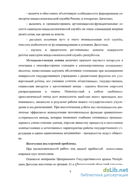 Таким образом, историографический анализ свидетельствует, что в трудах историков накоплен определенный материал, дающий основание для диссертационного исследования процесса формирования санитарно-эпидемиологической службы Дагестана. Однако, несмотря на наличие отдельных работ, история становления санитарно-эпидемиологической службы не была предметом специального и комплексного исследования.
