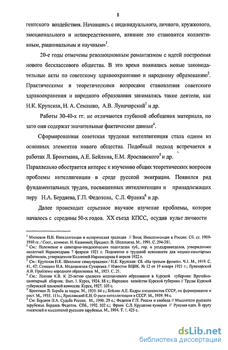 Сформированная советская трудовая интеллигенция стала одним из основных элементов нового общества. Подобный подход встречается в работах Л. Бронтмана, А.Е. Бейлина, Е.М. Ярославского5 и др. Параллельно обостряется интерес к изучению общих теоретических вопросов проблемы интеллигенции в среде русской эмиграции. Появился ряд фундаментальных трудов, посвященных интеллигенции и принадлежащих перу Н.А. Бердяева, Г.П. Федотова, С.Л. Франка6 и др.