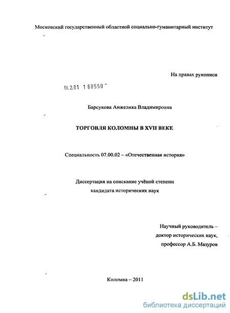 Цель настоящего диссертационного исследования – исследование развития торговли Коломны в начальный период складывания всероссийского рынка. Специальное изучение конкретной истории торговых связей Коломны позволит приблизиться к решению более широкого вопроса о характере внутреннего рынка в России в XVII в. на локальном материале.