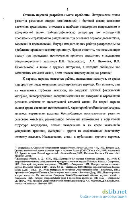 Наиболее ценными для настоящей работы оказались исследования, посвященные сельскохозяйственному развитию северокавказского региона и Ставрополья, в частности, в интересующий нас период В первую очередь внимание было обращено на труды Т А Невской, С А Чекменева, В П Невской, В М Кабузана, в которых исторические сюжеты разворачиваются вокруг хозяйственных, бытовых и духовных традиций крестьянского населения33 Интересная информация о повседневных заботах села представлена в изданиях А Е Богачковой, А И Кругова, И М Зубенко и других по истории Ставропольского края, его районов и отдельных
