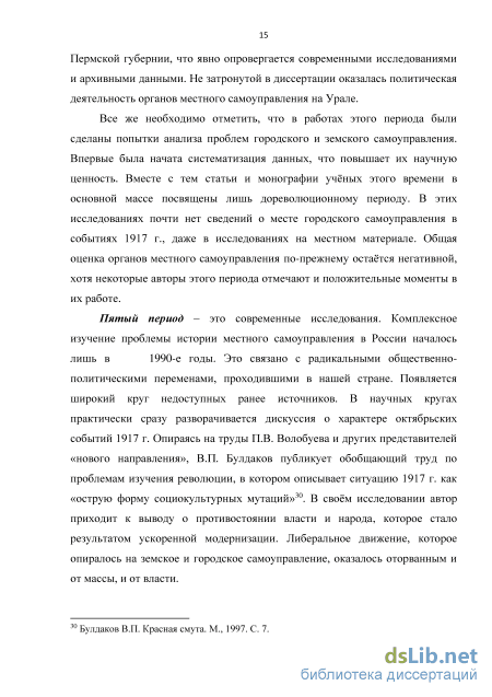 Степень изученности темы. Исходя из представлений о системе местного самоуправления, учёные по-разному рассматривали роль земств и городских дум в революционных изменениях в стране в 1917 г. Всю историографию местного самоуправления этого периода условно можно разделить на несколько периодов.