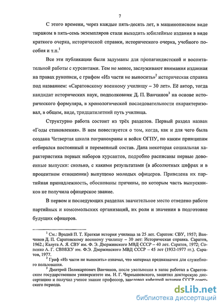 1 См.: Врадий П. Т. Краткая история училища за 25 лет. Саратов: СВУ, 1957; Ванчинов Д. П. Саратовскому военному училищу - 30 лет: Историческая справка. Саратов, 1962.; Калуга А. Я. СВУ им. Ф. Э. Дзержинского МВД СССР - 40 лет. Саратов, 1972; Со-пенко А. Г. СВВККУ им. Ф.Э. Дзержинского МВД СССР - 45 лет (1932-1977 гг.). Саратов, 1977.