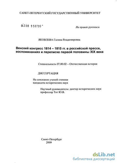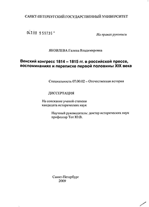 Делопроизводственные документы представлены различными официальными письмами . Важнейшим видом источников для данной диссертации стала русская периодическая печать 1814 - 1815 гг. Безусловно, пресса подвергалась цензуре. Практически все периодические издания в начале XIX в. находились в руках государства. Кроме того, Россия не имела своих корреспондентов на Венском конгрессе, поэтому информацию о его ходе вся российская пресса вынуждена была заимствовать из иностранных источников. Отметим, что подчас трудно безоговорочно отнести то или иное периодическое издание 1814 - 1815 гг. к либеральному или консервативному лагерю. Не следует также забывать, что порой «свободомыслие» издателей и редакторов являлось лишь отражением взглядов Александра I. Тем не менее, знакомство с прессой позволяет выяснить, каковы были представления о ходе конгресса в России, какие его аспекты были наиболее интересны, чего ожидали от конгресса и оправдались ли эти ожидания. Автором были изучены материалы газет: «Санкт-Петербургские ведомости» и «Санкт-Петербургские сенатские ведомости», «Московские ведомости», «Северная почта, или Новая Санкт-Петербургская газета», «Русский инвалид», и журналов: «Вестник Европы», «Дух журналов», «Сын Отечества», «Исторический, статистический и географический журнал». Публицистику составляют сочинения Н.И. Тургенева, М.А. Фонвизина, В.И. Штейнгейля39, С.С. Уварова40, Ю. Крюденер41; письмо B.C. Ланского к