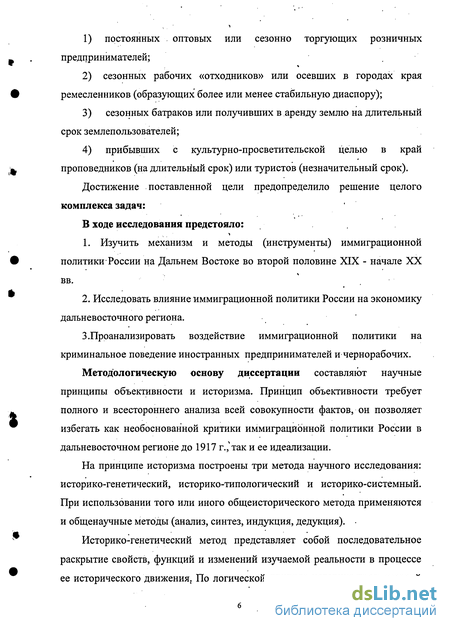 Методологическую основу диссертации составляют научные принципы объективности и историзма. Принцип объективности требует полного и всестороннего анализа всей совокупности фактов, он позволяет избегать как необоснованной критики иммиграционной политики России в дальневосточном регионе до 1917 г.,'так и ее идеализации.