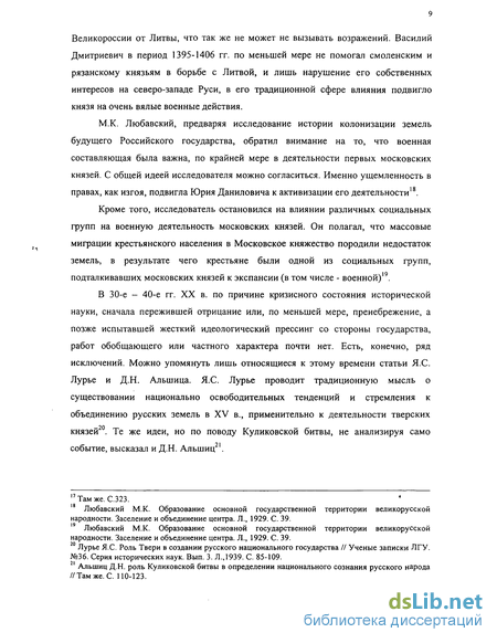 В 30-е - 40-е гг. XX в. по причине кризисного состояния исторической науки, сначала пережившей отрицание или, по меньшей мере, пренебрежение, а позже испытавшей жесткий идеологический прессинг со стороны государства, работ обобщающего или частного характера почти нет. Есть, конечно, ряд исключений. Можно упомянуть лишь относящиеся к этому времени статьи Я.С. Лурье и Д.Н. Альшица. Я.С. Лурье проводит традиционную мысль о существовании национально освободительных тенденций и стремления к объединению русских земель в XV в., применительно к деятельности тверских князей20. Те же идеи, но по поводу Куликовской битвы, не анализируя само событие, высказал и Д.Н. Альшиц21.