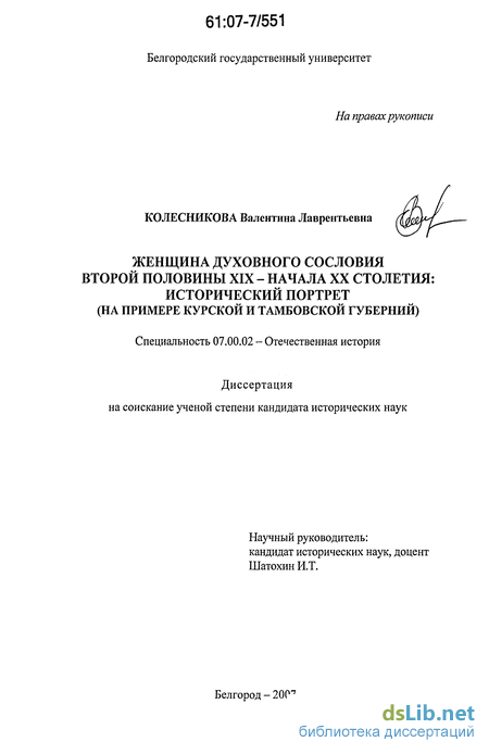 Использованные источники дали возможность провести многоплановое исследование места и роли женщины в духовном сословии и обществе в целом во второй половине XIX - начале XX вв., оформив ее исторический портрет на примере Курской и Тамбовской губерний.