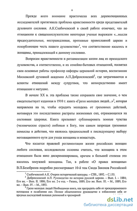 Прежде всего внимание практически всех дореволюционных исследователей притягивала проблема нравственности среди представителей духовного сословия. А.К.Скабичевский в своей работе отмечает, что по отношению к священнослужителям некоторые ученые выражали «...мысли предосудительные, несправедливые, противные православной церкви и оскорбляющие честь нашего духовенства»1, что соответственно касалось и женщины, принадлежащей к данному сословию.