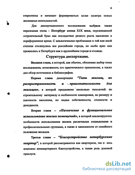 В диссертации делается попытка впервые рассмотреть с этой точки зрения городское жилище. Из всех российских городов мной выбран был Петербург, поскольку именно здесь разнообразие жилья было представлено наиболее полно. В столице было представлено жилище всех социальных слоев и групп, существовавших в России. По материалу постройки и размерам здесь были все возможные варианты, начиная от деревянных избушек до многоэтажных с сотнями квартир каменных домов с металлическими перекрытиями. В Петербурге были представлены все виды жилищной собственности: арендованное, кооперативное, собственное, ведомственное и заводское жилье. В столице нашли применение все известные в то время устройства квартирного и внеквартирного благоустройства.
