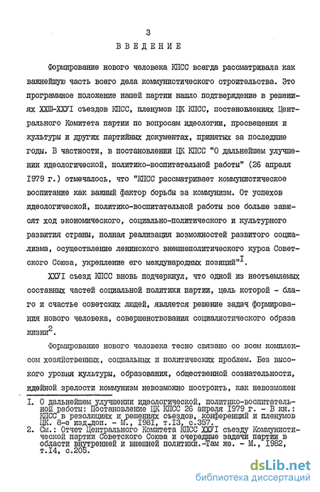 Формирование нового человека КПСС всегда рассматривала как важнейшую часть всего дела, коммунистического строительства. Это программное положение нашей партии нашло подтверждение в решениях ХХШ-ХХУІ съездов КПСС, пленумов ЦК КПСС, постановлениях Центрального Комитета, партии по вопросам идеологии, просвещения и культуры и других партийных документах, принятых за последние годы. В частности, в постановлении ЦК КПСС "О дальнейшем улучшении идеологической, политико-воспитательной работы" (26 апреля 1979 г.) отмечалось, что "КПСС рассматривает коммунистическое воспитание как важный фактор борьбы за коммунизм. От успехов идеологической, политико-воспитательной работы все больше зависят ход экономического, социально-политического и культурного развития страны, полная реализация возможностей развитого социализма, осуществление ленинского, внешнеполитического курса Советского Союза, укрепление его международных позиций. ХХУТ съезд КПСС вновь подчеркнул, что одной из неотъемлемых составных частей социальной политики партии, цель которой - благо и счастье советских людей, является решение задач формирования нового человека, совершенствования социалистического образа жизни .