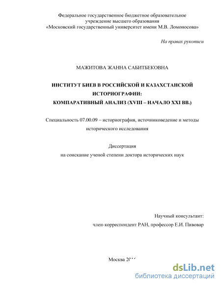 Актуальность темы исследования. На современном этапе развития Республики Казахстан перед казахстанской историографией стоит исключительно важная задача формирования новой концепции истории Казахстана. Изменение политической и общественной ситуации в конце 1980-х – начале 1990-х гг. привело к тому, что были сняты идеологические скрепы, мешавшие исследователям свободно оперировать историческими данными, запреты на интерпретацию исторических процессов и явлений. В обществе появляется устойчивое стремление к критическому переосмыслению и верификации прошлого, основанное на отходе от прежних идеологических догматов, к созданию собственной истории. Одним из основных вопросов, привлекших в это время внимание самых разных исследователей и активно обсуждаемых в научной среде и в средствах массовой информации, стала история казахской государственности. В ее возникновении и становлении участвовали различные исторические деятели с опорой на традиционные социальные институты. Фундаментальным для властных отношений в традиционном обществе являлся институт биев. Оценки этого института в различные исторические периоды были противоречивыми и неоднозначными, дискуссии на эту тему, несколько меняя свой характер, продолжались, и отношение к нему, его понимание, несмотря на обилие собранных материалов, до сих пор остается неоднозначным. Иначе говоря, не только сам институт, но и история его изучения попадают в поле зрения ученых и становятся отдельной проблемой, которая требует специального внимания и анализа для понимания истоков и контекстов появления тех или иных источников и их интерпретаций.