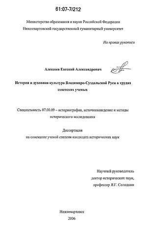 Предметом диссертационного исследования служит изучение истории и духовной культуры Владимиро-Суздальского княжества в отечественной науке 1920-х-начала 1990-х гг.