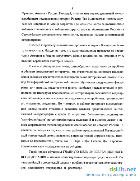 В связи с обширностью темы, разнообразием затрагиваемых проблем и обилием англоязычной литературы, мы ограничили рамки своего исследования работами представителей Калифорнийской исторической школы. Выбор Калифорнийской исторической школы обусловлен следующими факторами: во - первых, представители школы наиболее последовательно и разносторонне исследуют процесс изменения территории российского государства, четко определив основные исследовательские проблемы: причины, цели, участники, результаты. Во - вторых, в работах историков вышеуказанной школы нашли отражение основные взгляды представителей англоязычной историографии в целом. В - третьих, большинство выдвинутых "калифорнийцами" историографических положений и выводов лежат в основе современного взгляда зарубежных славяноведов на историю России. И, наконец, несмотря на то, что первые работы представителей Калифорнийской исторической школы появились в период первой мировой войны, некоторые ее представители, такие как Р. Пирс и Дж. Гибсон, Дж. Харрисон, продолжают свои исследования и по сей день.