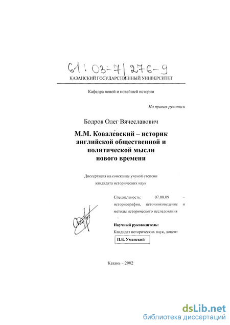 Бодров Олег Вячеславович. М. М. Ковалевский - историк английской общественной и политической мысли нового времени : диссертация ... кандидата исторических наук : 07.00.09.- Казань, 2002.- 331 с.: ил. РГБ ОД, 61 03-7/276-9