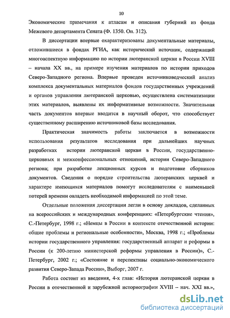 7 содержащих основные источники по истории лютеранских приходов на Северо-Западе России. Ограничение числа фондов и их отбор обусловлены, прежде всего, тем, что выявление и анализ всей совокупности документальных материалов по этой теме, хранящихся в РГИА, в пределах одной диссертационной работы является практически невозможным.
