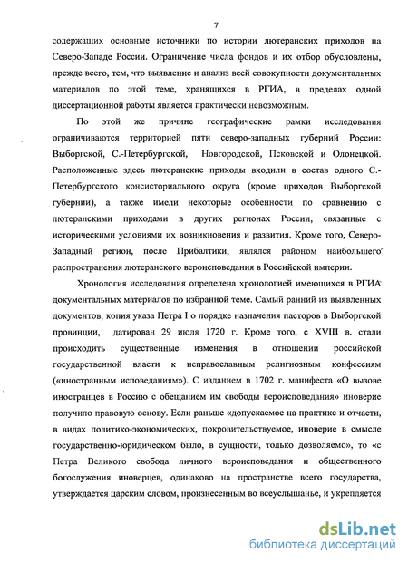 По этой же причине географические рамки исследования ограничиваются территорией пяти северо-западных губерний России: Выборгской, С.-Петербургской, Новгородской, Псковской и Олонецкой. Расположенные здесь лютеранские приходы входили в состав одного С.-Петербургского консисториального округа (кроме приходов Выборгской губернии), а также имели некоторые особенности по сравнению с лютеранскими приходами в других регионах России, связанные с историческими условиями их возникновения и развития. Кроме того, Северо-Западный регион, после Прибалтики, являлся районом наибольшей/ распространения лютеранского вероисповедания в Российской империи.