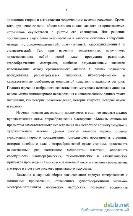 Методологические основы исследования. Настоящее исследование, основанное на комплексном использовании исторических источников различных типов (вещественных, письменных, картографических и изобразительных), позволяет говорить о применении при анализе единых принципов теории и методологии современного источниковедения. Кроме того, при использовании общих методов анализ каждого из привлекаемых источников осуществлен с учетом его специфики. Для решения поставленных задач были использованы в качестве основных следующие методы: историко-описательный, сравнительный, классификационный и статистический. Так, при изучении вещественных источников, представляющих собой целый пласт продукции различных старообрядческих мастерских, наиболее результативным является использование метода сравнительного анализа. В рамках подобного исследования рассматривается типология, иконографические и художественные особенности меднолитой пластики отдельного региона. Полнота изучения выбранного вещественного материала возможна лишь на основе междисциплинарного исследования с использованием данных таких дисциплин, как история, религиоведение, история искусств, история науки и техники.