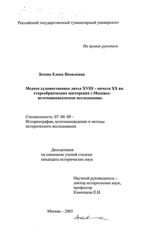 Главная цель исследования - изучение и характеристика медного художественного литья второй половины XVIII - начала XX вв. московского производства как целостного социокультурного и художественного явления.