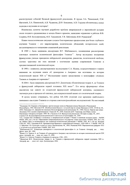 В 1989 г. была защищена диссертация И.Г. Шаблинского, посвященная рассмотрению ключевых моментов политической философии Токвиля1. Автор исследовал восприятие французским ученым принципов либеральной демократии, равенства, политической свободы, соотнес трактовку им этих явлений с ключевыми идеями политических теорий его времени.