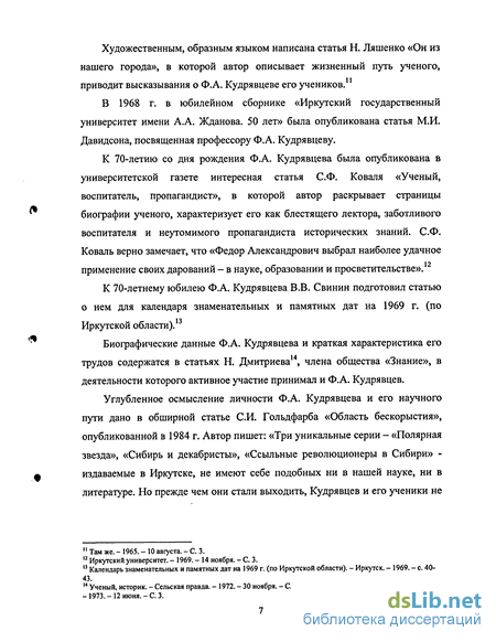 В 1970 г. Ф.А. Кудрявцев представил доклад42, обобщающий содержание его научных работ с 1925 по 1970 гг., связанных с основными этапами развития советской историографии Сибири. Ф.А. Кудрявцеву по совокупности научных трудов была присвоена ученая степень доктора исторических наук.