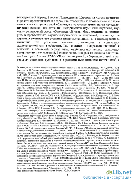Степень научной разработанности проблемы. Религиозно-политическая история Англии в XVI-XVII вв. в отечественной исторической науке не является областью, в которой когда-либо были сосредоточены значительные исследовательские усилия. Для изучения этих проблем необходимо было специальное обращение к истории протестантизма, англиканства, протестантских богословских доктрин, но в XIX-XX вв. и до 1917 года, и в советский период по разным причинам ситуация не была благоприятной для глубокого изучения тех или иных протестантских вероисповеданий и религиозно-политической истории: в дореволюционный период Русская Православная Церковь не хотела пропагандировать протестантизм и сдержанно относилась к проявлениям исследовательского интереса в этой области, а в советское время, когда методологической основой отечественной исторической науки был марксизм, изучение религиозной сферы общественной жизни было смещено на периферию в проблематике научно-исторических исследований, поскольку религиозное сознание трактовалось лишь как деформированное идеологическое следствие тех процессов, которые происходили в социально-экономической жизни общества. Тем не менее, и в дореволюционный, и особенно в советский период был опубликован ряд конкретно-исторических исследований, большая часть которых посвящена политической истории Англии XVI-XVII вв.: монографий, сборников статей и отдельных статейных публикаций с редкими публикациями источников, а также выполнен ряд кандидатских диссертаций.