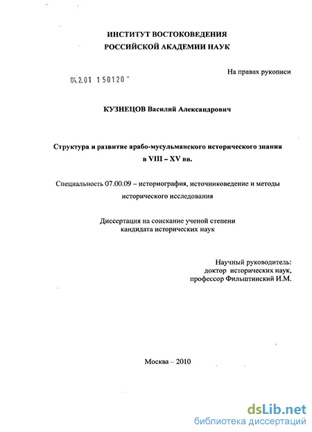 Источники. Решение задач, поставленных в настоящем исследовании, потребовало обращения к широкому кругу источников. В качестве основного источникового материала были выбраны всемирноисторические хроники и теоретические работы по историописанию. В этих текстах исторические взгляды изучаемого общества выражаются в наиболее полной и последовательной форме, кроме того, в них предпринимаются попытки концептуализации исторического познания. Наконец, эти тексты оказывали огромное влияние на развитие всего историописания в целом, и в них наиболее ярко проявлялись тенденции, характеризующие средневековую арабо-мусульманскую историческую мысль на том или ином этапе.