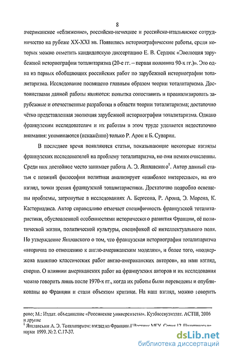 В последнее время появляются статьи, показывающие некоторые взгляды французских исследователей на проблему тоталитаризма, но они немної очисленны. Среди них достойное место занимает работа Л. Э. Яшлавскої о1. Автор данный статьи с позиций философии политики анализирует «наиболее интересные», на его взгляд, точки зрения французской тоталитаристики. Достаточно подробно освещены проблемы, затронутые в исследованиях А. Бергсона, Р. Арона, Э. Морена, К. Касториадиса. Автор справедливо отмечает специфичность французской тоталитаристики, обусловленной особенностями историческою развития Франции, её политической жизни, политической культуры, спецификой её интеллектуального поля. Но утверждение Яшлавского о том, что французская историография тоталитаризма «вторична по отношению к англо-американским моделям», и более того, «подвержена влиянию классических работ англо-американских авторов», на наш взгляд, спорно. О влиянии американских работ на французских авторов и их исследования можно говорить лишь после 1970-х гг., когда их работы были переведены и опубликованы во Франции и стали объектом критики. На наш взгляд, можно говоритьрово; М.: Издат. объединение «Российские университеты». Кузбас с вузиздат, АСТШ, 2006 и другие