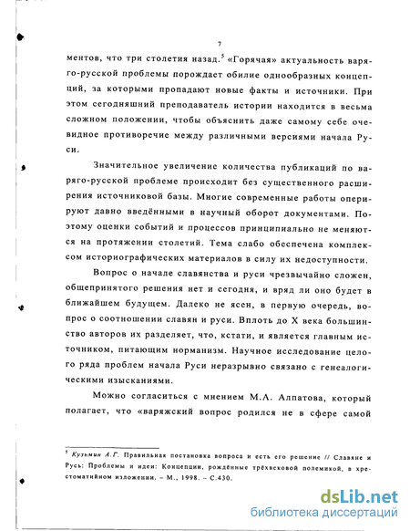 Актуальность темы. Варяго-русская (или норманская) проблема является одной из центральных в древнерусской истории. По сей день она сохраняет принципиальное значение в курсе, читаемом в вузах, и в школьном преподавании. Ни один учёный, занимающийся славяно-русскими древностями, не обходил эту тему. Отношением к варяго-русскому вопросу во многом определяется точка зрения того или иного исследователя на последующие события истории нашего Отечества. В целом постановка и решение историографических проблем, связанных с варяго-русским вопросом, возможна в русле общей постановки норманской проблемы.