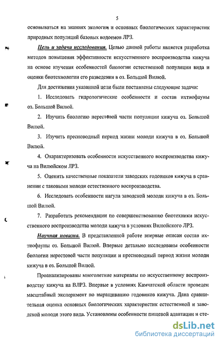 Цель и задачи исследования. Целью данной работы является разработка методов повышения эффективности искусственного воспроизводства кижуча на основе изучения особенностей биологии естественной популяции вида и оценки биотехнологии его разведения в оз. Большой Вилюй.