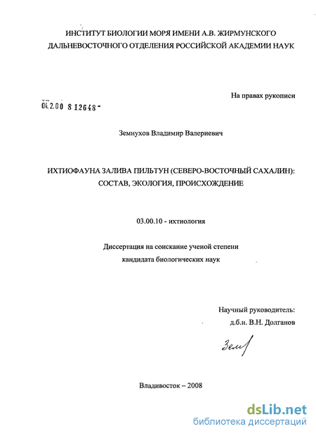 Благодарности. Автор выражает глубокую благодарность своему научному руководителю д.б.н. Долганову В.Н. за помощь в работе, а также д.б.н. Соболевскому Е.И. и сотрудникам ТИНРО-центра Мишановой О.А., к.б.н. Панченко В.В. и к.б.н. Антоненко Д.В. за помощь в сборе материала, сотрудникам ИБМ Соколовской Т.Г. и к.б.н. Соколовскому А.С. за помощь и поддержку в работе над диссертацией, а сотрудникам ИБМ к.б.н. Харину В.Е., к.б.н. Паренскому В.А., к.б.н. Баланову А.А. и д.б.н. Суханову В.В. за помощь в работе и ценные замечания.