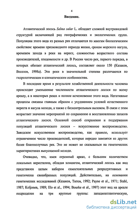 Актуальность темы. Атлантический лосось Salmo salar L. обладает сложной внутривидовой структурой, включающей ряд географических и экологических групп. Популяции этого вида из разных рек отличаются по многим биологическим характеристикам: продолжительности пресноводного периода жизни, срокам морского нагула, времени захода в реки на нерест, сложности возрастного состава производителей, плодовитости и др. В России число рек первого порядка, в которых обитает атлантический лосось, составляет около 150 (Казаков и др., 1990). Эти реки значительно различаются по гидрологическим и климатическим особенностям.