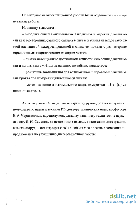 Целью диссертационной работы является научное обоснование и анализ предельно достижимой точности измерения энергетических параметров импульсных сигналов (длительность и амплитуда) на основе рассмотрения методической составляющей погрешности, а также синтез оптимальных структур измерительных устройств.