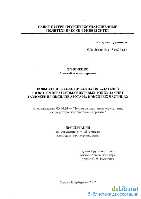 Тринченко Алексей Александрович. Повышение экологических показателей низкотемпературных вихревых топок за счет разложения оксидов азота на коксовых частицах : диссертация ... кандидата технических наук : 05.14.14.- Санкт-Петербург, 2002.- 187 с.: ил. РГБ ОД, 61 03-5/1351-6