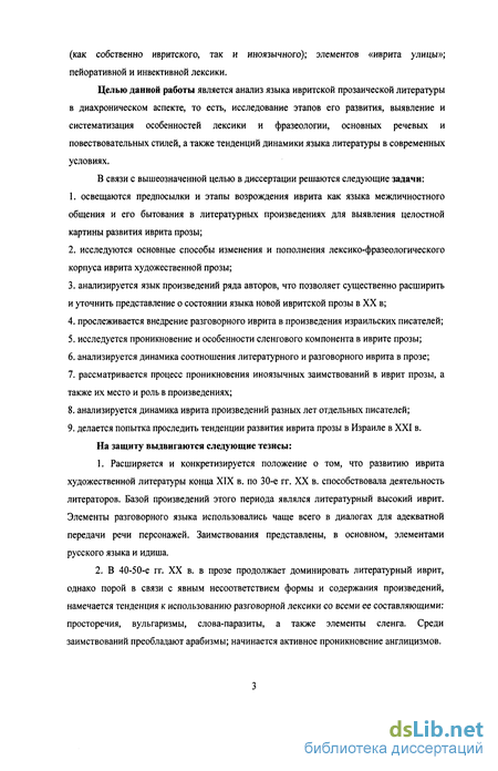 Целью данной работы является анализ языка ивритской прозаической литературы в диахроническом аспекте, то есть, исследование этапов его развития, выявление и систематизация особенностей лексики и фразеологии, основных речевых и повествовательных стилей, а также тенденций динамики языка литературы в современных условиях.