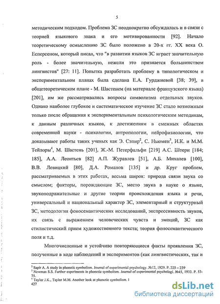 методическим подходом. Проблема ЗС неоднократно обсуждалась и в связи с теорией языкового знака и его мотивированности [92]. Начало теоретическому осмыслению ЗС было положено в 20-х гг. XX века О. Есперсеном, который писал, что "в развитии языков ЗС играет значительную роль - более значительную, нежели это признается большинством лингвистов" [27: 11]. Попытка разработать проблему в типологическом и экспериментальном планах была сделана Е.А. Гурджиевой [38; 39], в общетеоретическом плане - М. Шастенем (на материале французского языка) [201], им же рассматривались вопросы символизма отдельных звуков. Однако наиболее глубокое и систематическое изучение ЗС стало возможным только после обращения к экспериментальным психологическим методикам, к данным различных языков, к достижениям в смежных областях современной науки - психологии, антропологии, нейрофизиологии, что доказывают работы таких ученых как Э. Сэпир", С. Ньюмен , И.К. и М.М. Тейлоры4, М. Шастень [201], Ж.-М. Петерфальфи [219] А.С. Штерн [184; 185], А.А. Леонтьев [82] АЛ. Журавлев [51], А.Б. Михалев [100], В.В. Левицкий [80], Д.А. Романов [135] и др. Круг проблем, рассматриваемых в этих работах, весьма широк: природа связи звука со смыслом; факторы, порождающие ЗС, место звука в науке о языке, звукоподражательные и другие теории происхождения языка и речи, универсальный и национальный характер ЗС, элементарный и структурный ЗС, методология фоносемантических исследований, экспрессивность звуков, их связь с выражением человеческих чувств и эмоций, ЗС как стилистический прием художественного текста; теория фоносемантического поля и т.д.