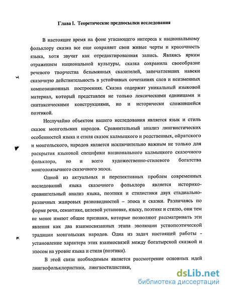 Сказочный фольклор монгольских народов достаточно хорошо изучен. Так, калмыцкие сказки рассматривались в литературоведческом отношении известными учеными-фольклористами М.Э. Джимгировым, профессором А.Ш. Кичиковым, В.Т. Саранговым, Т.Г. Борджановой и др., бурятские - Ц. Жамцарано, Б. Барадиным, А.И. Улановым, Е.В. Баранниковой, М.И. Тулохоновым, С.С. Бардахановой, Б.-Х. Б. Цыбиковой и др., монгольские - Ц. Дамдинсурэном, П. Хорлоо, Ш. Гаадамбой и др. В существующей литературе по монголоведению можно найти ответ на самые разные вопросы, касающиеся сюжетики и образной системы калмыцких народных сказок, но отсутствуют работы, в которых бы ставились и решались задачи, связанные с тем, как соотносятся между собой язык и поэтика фольклора, в чем заключается языковая специфика фольклорных жанров. Текст сказок до сих пор не становился объектом лингвистического анализа, нет специальных исследований, посвященных изучению языка монгольских (в том числе калмыцких) сказок, за исключением кандидатской диссертации Б.Д. Цыренова «Язык бурятских народных сказок» [Цыренов 2001].